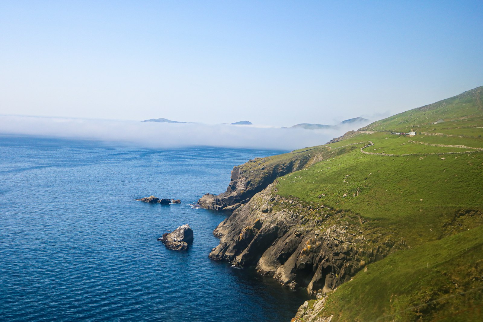The descent from Connor Pass transitions through landscape changes that rival any drive in Ireland. Within minutes, terrain shifts from exposed mountain terrain to gentle farmland, then to coastal cliffs as the western section approaches.
